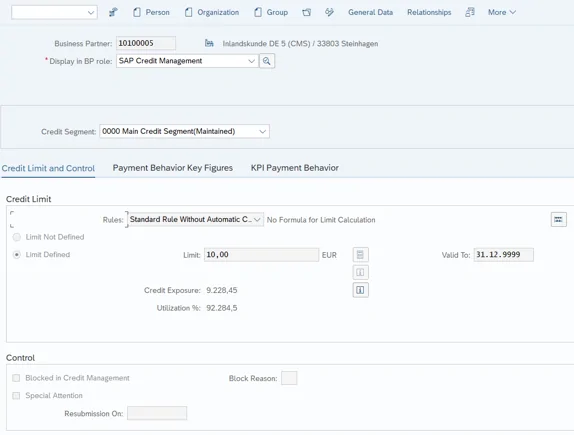 In SAP S/4HANA, the business partner data relevant for the credit check are bundled in the business partner’s master record, where they can be maintained manually. For this, the role “UKM000 – SAP Credit Management” must be assigned to the business partner and appropriately populated. The role must also be taken into account for the relevant users in the authorization concept. Transaction FD32 which was available in the in the previous Credit Management for maintaining the credit limit at the debtor level is no longer available.