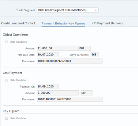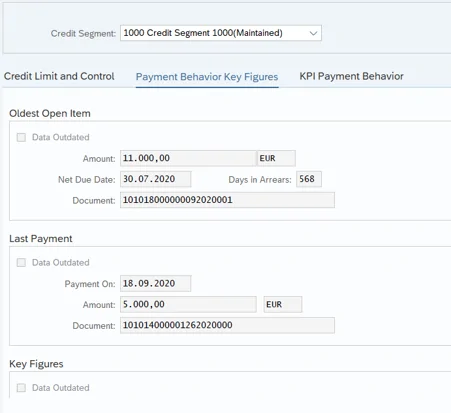 If further information – e.g. relating to payment behavior, the current highest dunning level or the oldest open item – is needed for maintaining the master data, this can be displayed directly in another tab. The key figures can be imported from BI or cloud solutions or, for debtor data, supplemented via the report UKM_TRANSFER_VECTOR (Send key figures on payment behavior).