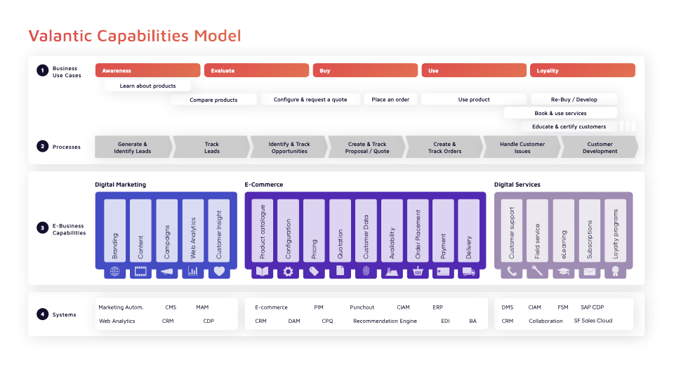 The Business Transformation Capabilities model developed by valantic supports organizations in systematically identifying, prioritizing, and effectively developing their business-critical capabilities using low-code.