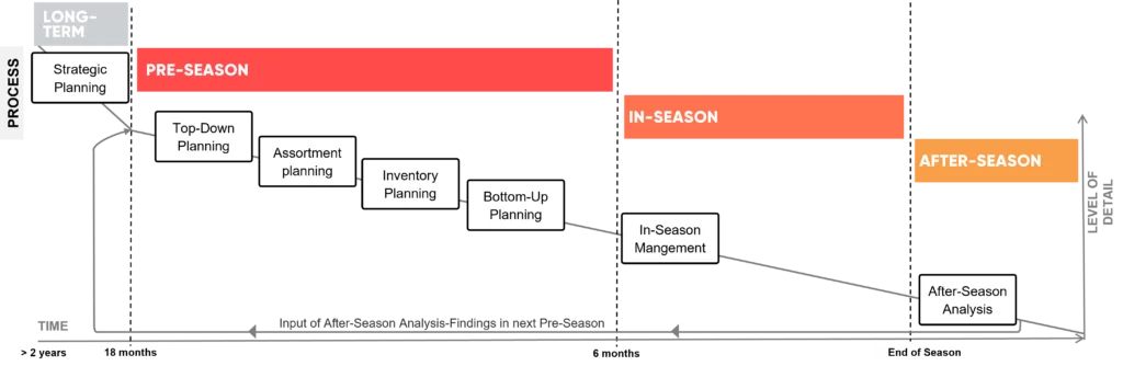 Everything starts with the strategic planning where the company’s long-term goals are defined. Here, sales data and market and customer trends are analyzed to forecast demand, determine their product assortment and the right quantity of goods, and formulate a pricing and advertising strategy for the sales period concerned.