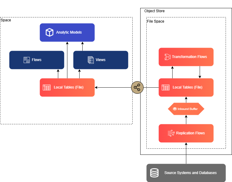 One very promising innovation is the object store. It provides a resource-efficient entry layer for the provision of large amounts of data. Administrators can create file spaces in the object database. This principle is already familiar from classic spaces. Data can only be loaded in a file space through replication flows and then stored in a local table (file). It is not possible to import or export CSV/JSON files. Optionally, the local table (file) can then be prepared further with a transformation flow. Subsequently, the prepared file can be shared with a classic space and used as a local table there.