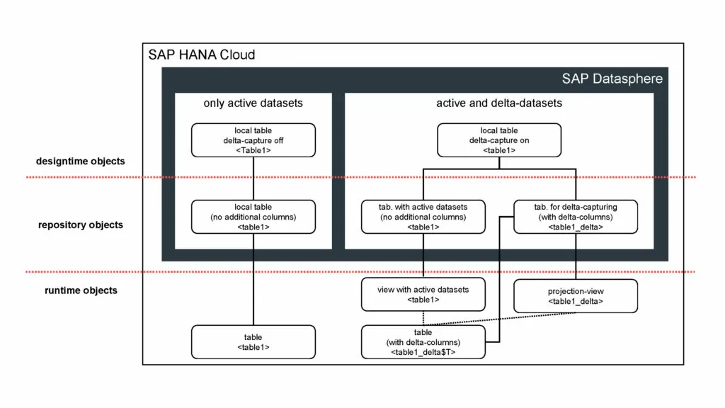 It is commonly known that local tables are used as the source or target objects of many Datasphere objects. These are now able to capture, or track, changes (deltas). This is done by enabling the Delta Capture option. When this is done, a new table is created in which two additional columns are automatically added next to the key of the main table: