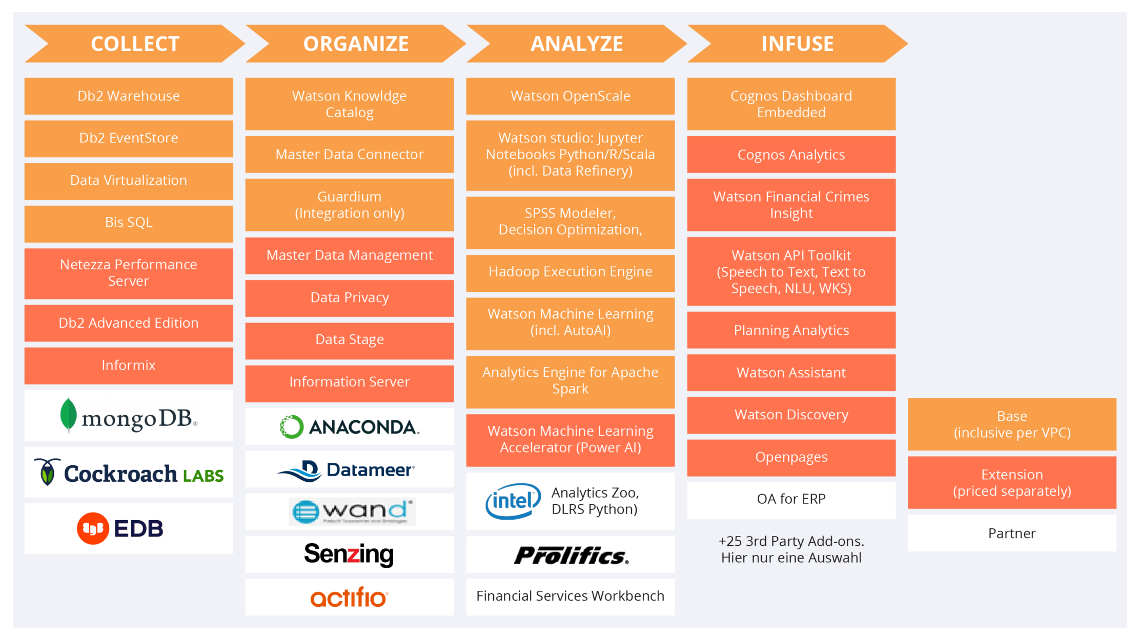 IBM Cloud Pak for Data is an integrated, secure, highly scalable platform that implements an information architecture for data and artificial intelligence in any cloud. The Cloud Pak combines the technologies and solutions relevant to data analysis that IBM has developed. IBM Cloud Pak for Data runs under a partially automated architecture, including Watson Assistant, Watson Discovery, Cognos Analytics, Planning Analytics/TM1, DB2, DWH, and Red Hat OpenShift. It can be used in every operating/procurement model, from on-premise to managed to complete “Software-as-a-Service” from the public cloud.