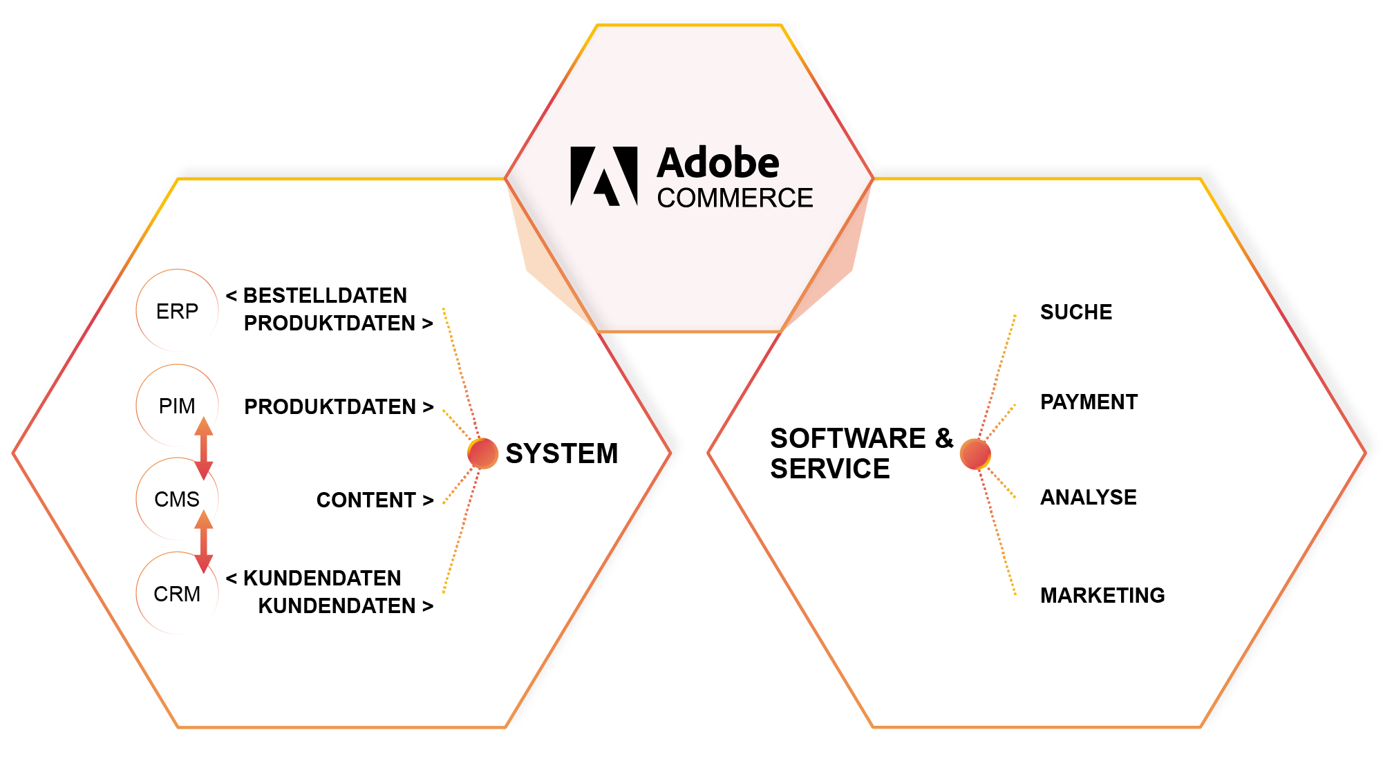 Are you looking for a way to consolidate all the important information of your commerce infrastructure in one place? Our integration process ensures that data on orders, customers, products, and prices can be easily exchanged through a unified IT system. We merge Adobe Commerce with your ERP and PIM systems to create a single application landscape, improving data processing and communication efficiency.