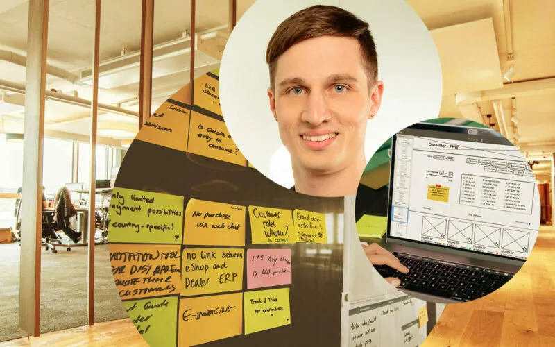 Picture of Urs Haeusler, managing director at valantic CEC Switzerland, next to it a picture of a smartphone and behind it pictures of Post-It's on a whiteboard and people in the corridor of a building