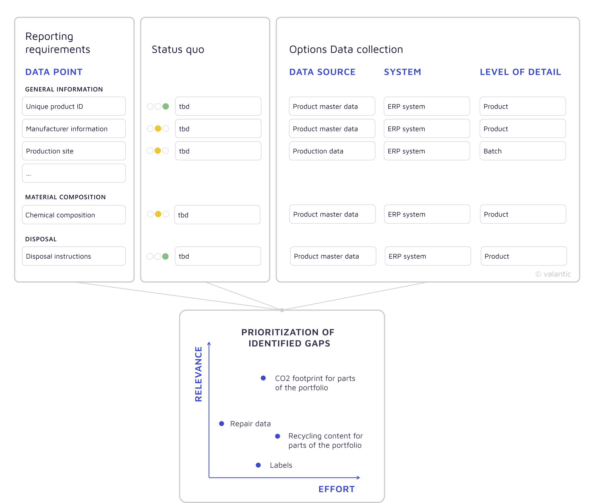 Based on regulatory requirements, we assess which DPP-relevant data is already available within your organization and identify any existing gaps. This includes product, process, and IT-related information.
