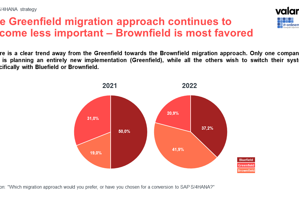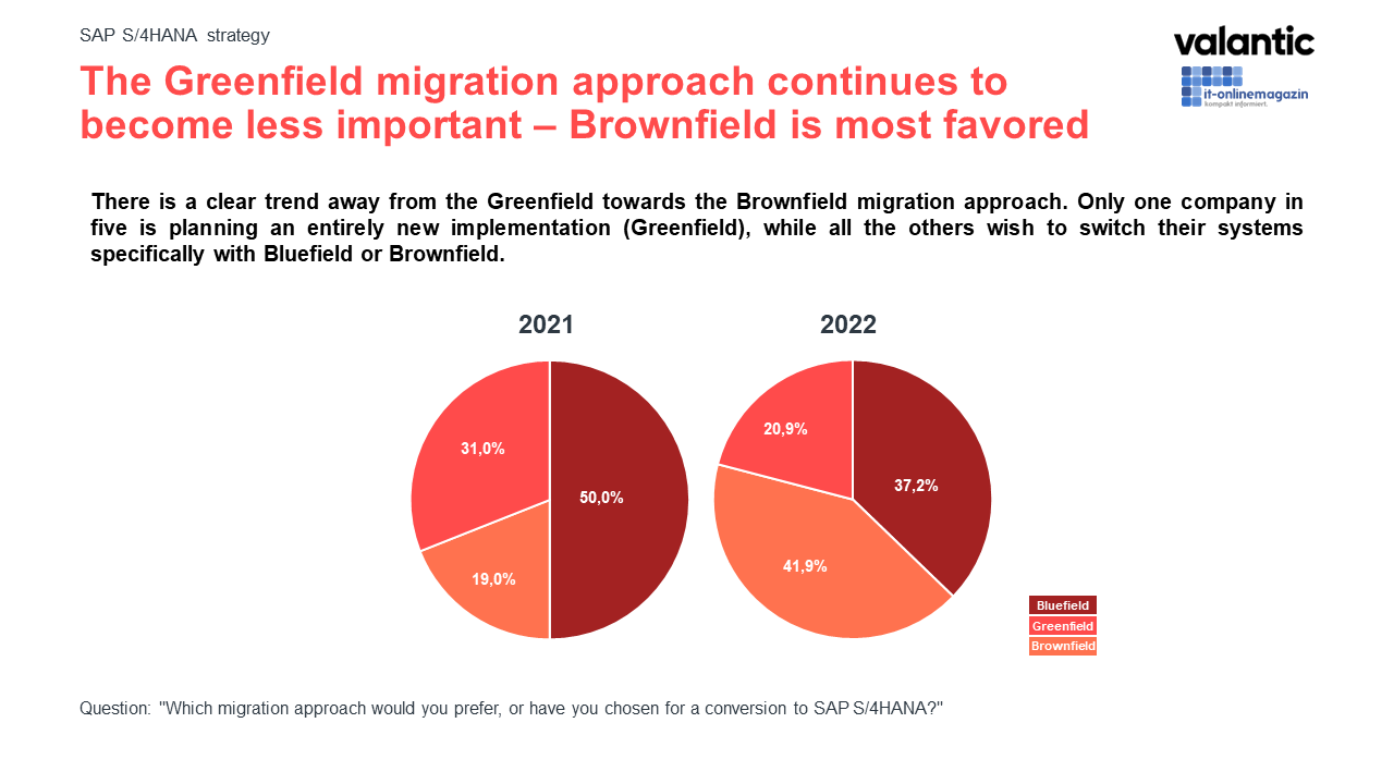 The brownfield system conversion is now the clear favorite (41.9%, or more than double the 19% reported in 2021) as migration approach.