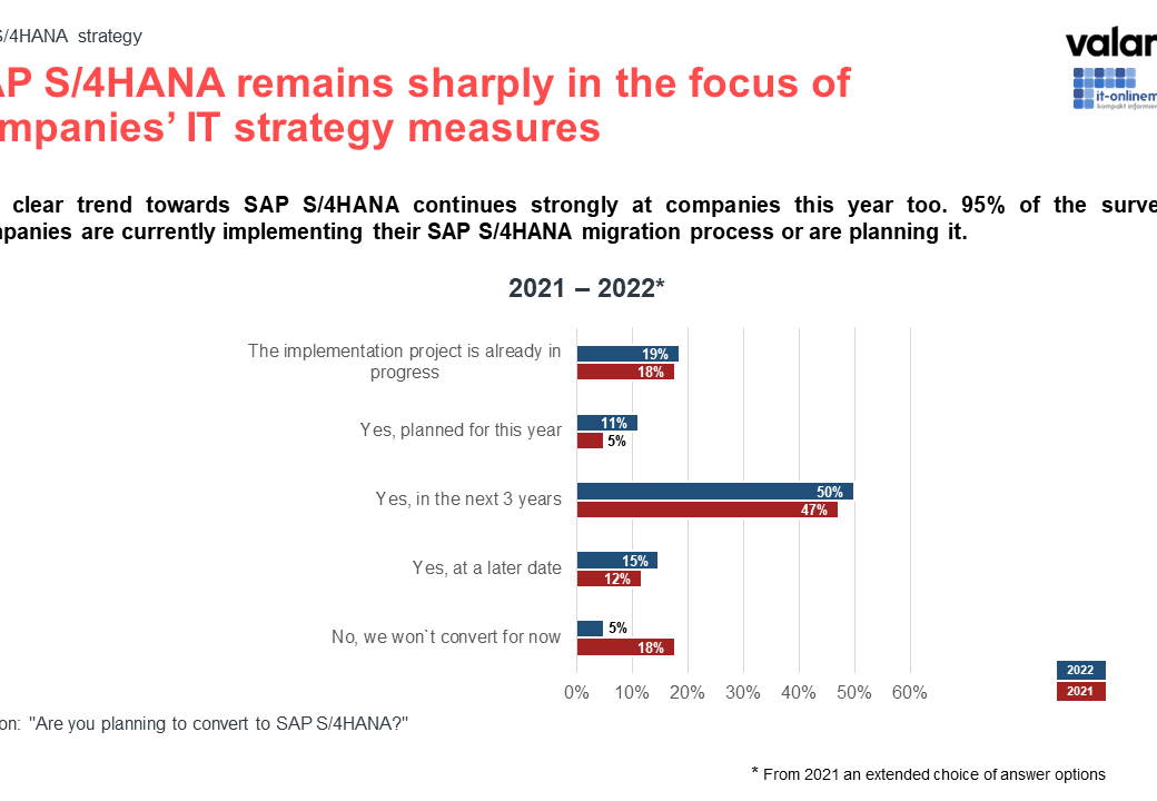 Get to know usMunich, May 10, 2022: With its SAP S/4HANA Study 2022, the digital solutions, consulting and software house valantic has asked SAP user companies for the fifth consecutive year about their opinions on the business software. Its findings show the clearest signs yet of a market trending towards change, although further information would still appear to be needed about the cloud offering. The respondents saw process mining as an interesting topic of the future. This year’s study was supported by IT-Onlinemagazin as a media partner.