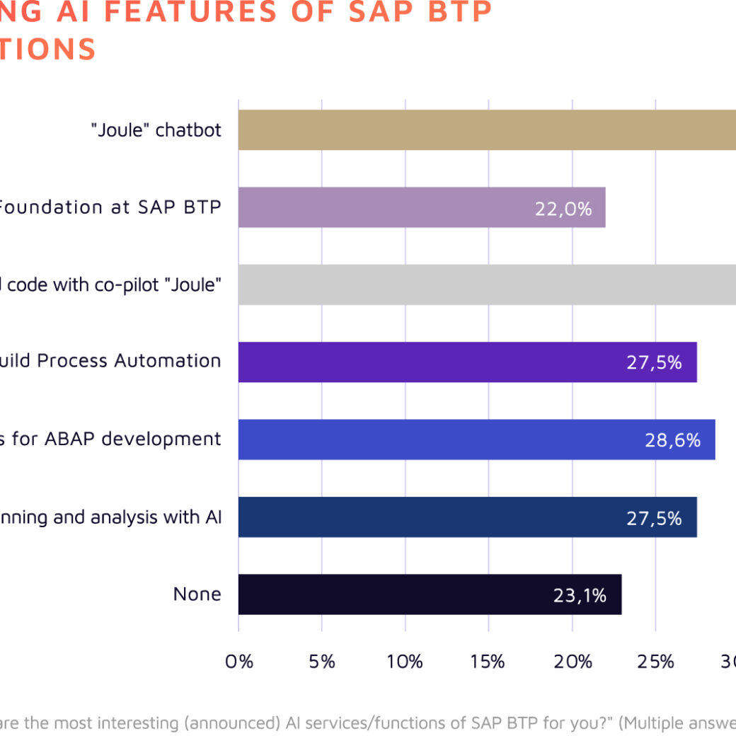 The large number of in-house developments that need to be migrated to the cloud, coupled with the limited ability to influence cloud operations, are causes for concern among the hesitators (in each case 47.6%). The SAP Business Technology Platform (BTP), which 64 percent view primarily as an integration engine, could be crucial in facilitating the migration of in-house developments and AI add-ons. However, there is still a significant need for information, especially regarding AI. Only 5.5 percent of respondents have explored the current AI functionalities offered by BTP, while 36.7 percent have taken an initial look. As for the remaining 57.8 percent? Niente!