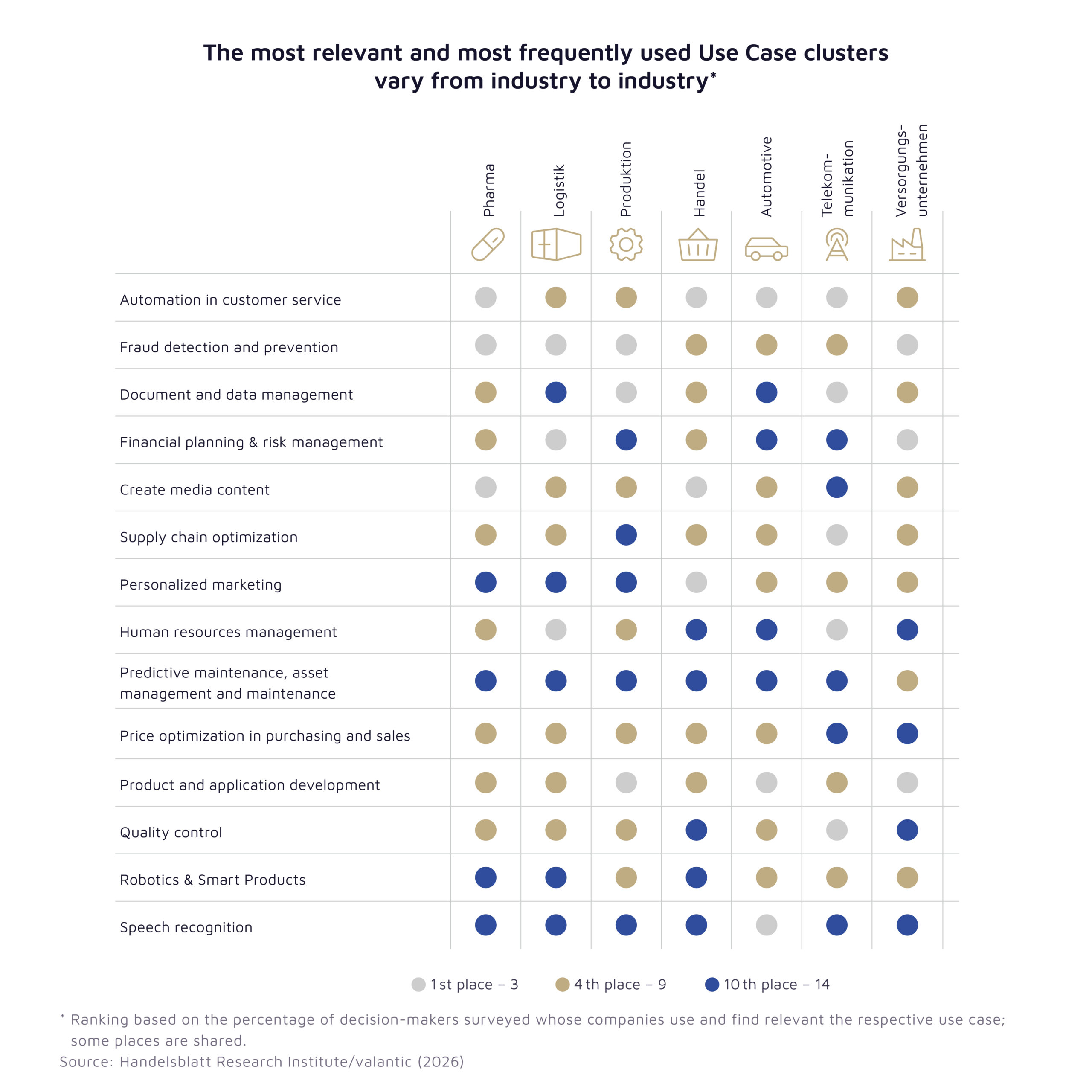Around 65 percent of retailers use AI for supply chain optimization and inventory planning, of which 34 percent recognize added value. The benefits of AI applications for fraud detection and prevention are rated just as highly, with more than 60 percent using them. In terms of impact, these two use cases exceed the study average, which indicates that retailers are more advanced in operational, margin-specific applications than other sectors.