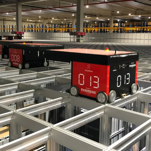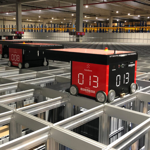 17 robots store 47,000 containers in STIHL Tirol's new automated small parts storage and stack the containers in aluminum trays.