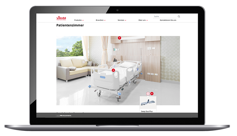Corporate customers (B2B) are assisted with decision-making and provided with relevant information. Question such as “How are products used correctly? How can you select products correctly according to the sector?” are answered in the Vileda Professional section. Here, in addition to detailed information about the special products, there are also virtual, industry-specific rooms. Customers can see examples of where which product can be used. The linking and placement of products in virtual rooms was implemented with SAP Commerce Cloud’s Inspiration Cockpit.