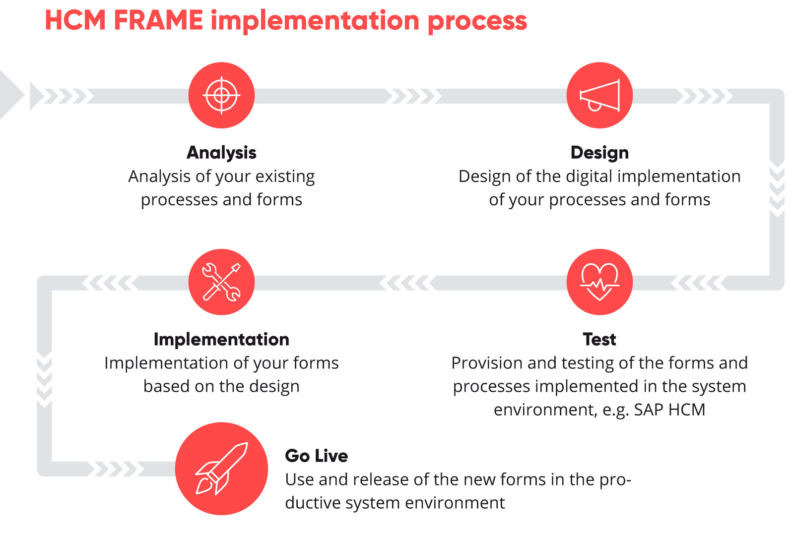 The implementation of HCM FRAME follows clearly defined project steps tailored to the customer.