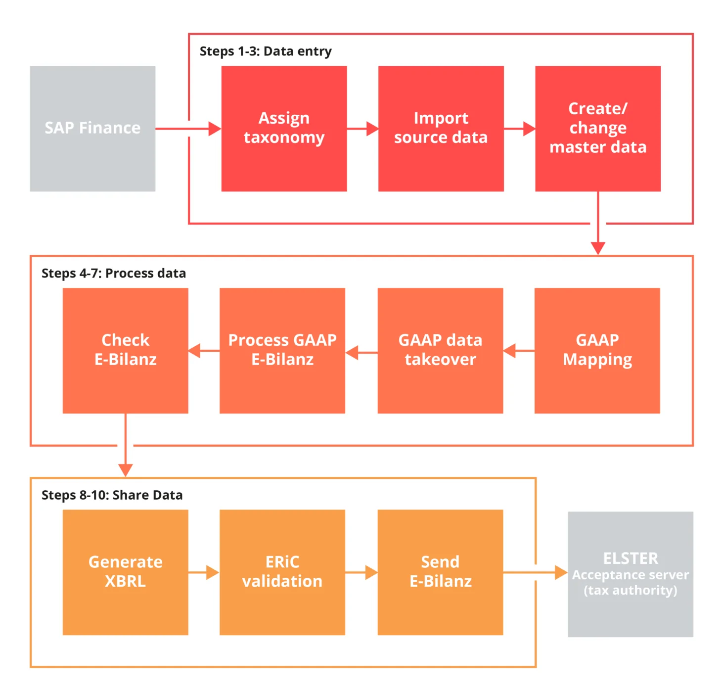 After importing the taxonomy specified by the financial authorities, master data can be created, balance sheets from SAP Finance imported (import from non-SAP systems is also possible), and the mapping of SAP accounts to the taxonomy performed. Once this is done, further adjustments such as tax adjustment booking can be made in the cockpit; these are documented in individual document storage.