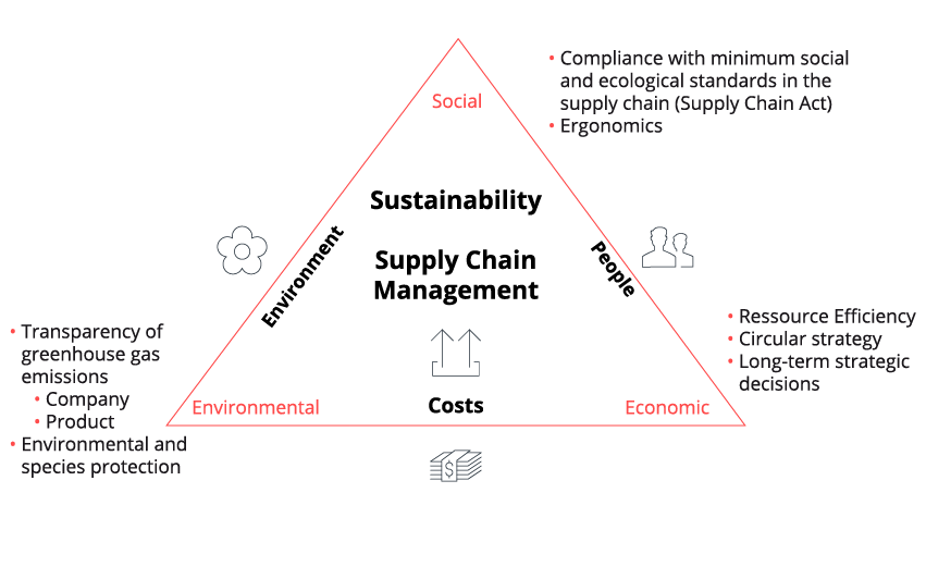 Sustainable supply chain management implements the management of materials, information, (production) processes, and capital flows in cooperation with all companies participating in the production process. The goal is to integrate the three dimensions of sustainable development – economics (costs), ecology (environment), and social (people) – along the entire value chain.