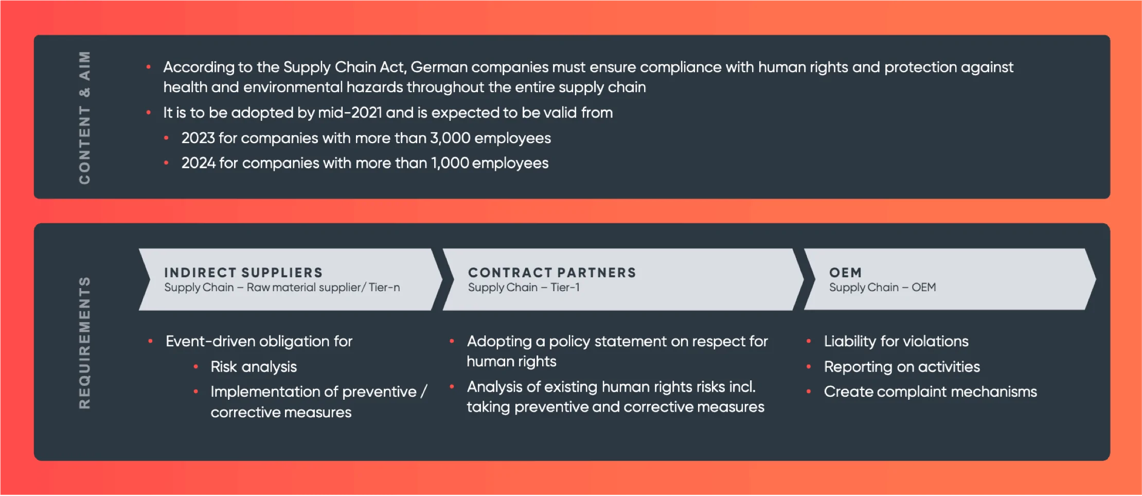 The assessment of ESG criteria is not limited to the company itself but is also applied along the entire value chain. Increasing regulatory requirements, such as the German Supply Chain Duty of Care Act and the European Corporate Sustainability Due Diligence Directive (CSDDD), necessitate proactive risk management regarding sustainability. The focus of implementation here is on assessing supplier risks along the supply chain and reviewing suppliers in terms of their ESG compliance and performance.