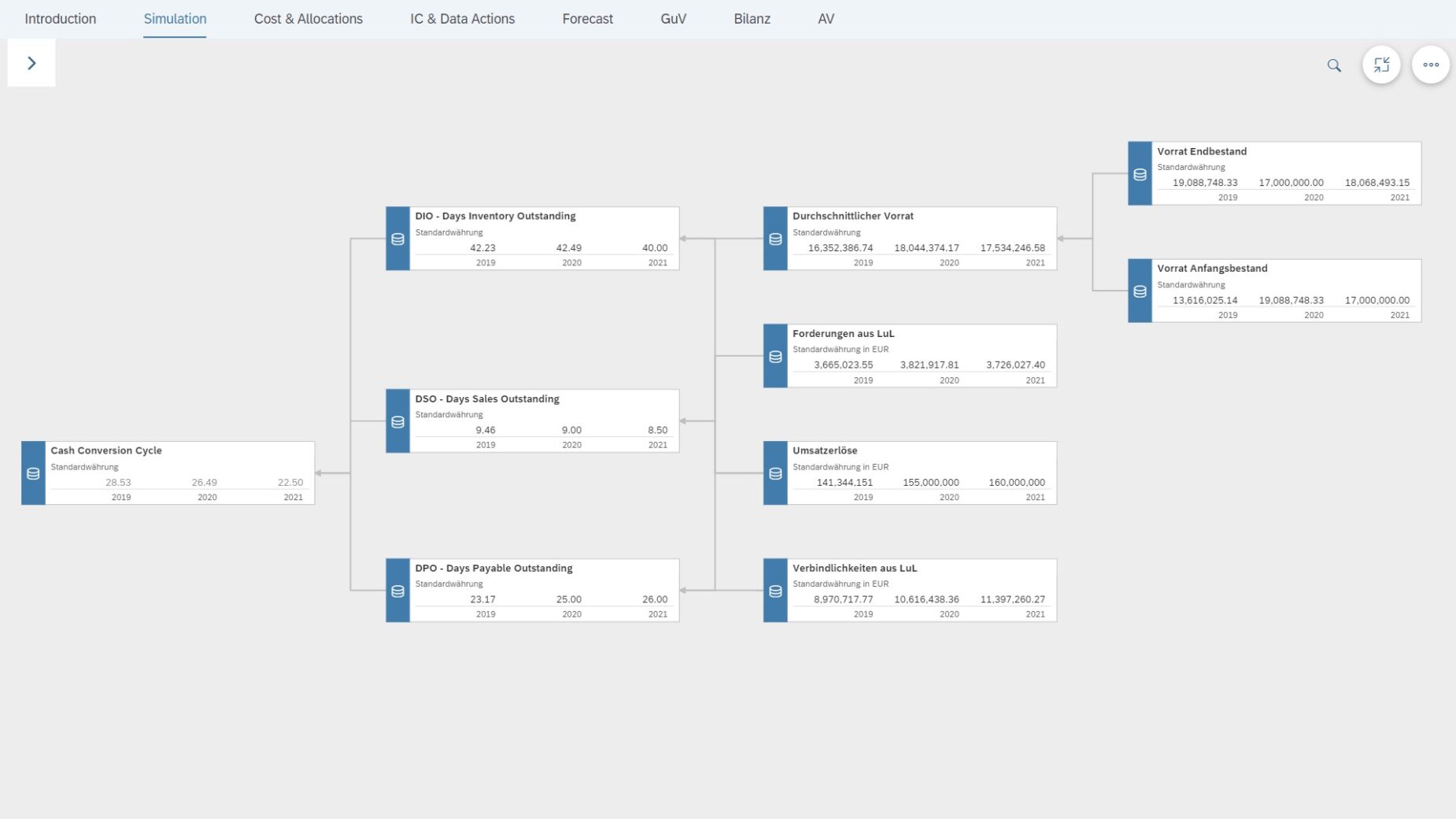 Con las funciones de planificación integradas, puedes incorporar tus datos de forma óptima y personalizarlos gracias a la semántica típica de la empresa, las conversiones de divisas y la lógica contable. Un caso de uso frecuente es la planificación financiera estratégica con tus planes parciales.