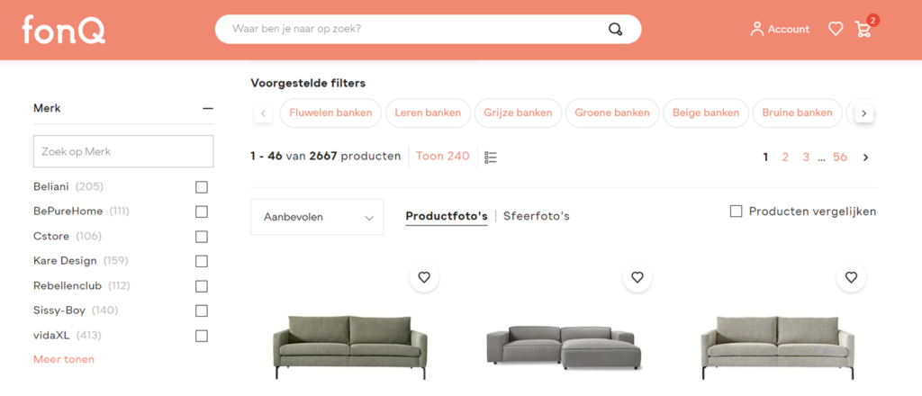 Naast het optimaliseren van de filterfunctionaliteit is het nuttig om snelfilters te tonen. Deze snelfilters zet je boven de eerste rij met producten. Met één druk op de knop kan een bezoeker hiermee een filter activeren en zo het productoverzicht versmallen. Het inzetten van snelfilters werkt vooral goed wanneer bepaalde filters extreem vaak worden geselecteerd. Maar je kunt ze ook gebruiken om de allerbelangrijkste filter nog eens extra uit te lichten. Zie je bijvoorbeeld dat de maatfilter op jouw fashion webshop het meeste wordt gebruikt? Dan is het een goede stap om de meest gekozen maten als snelfilters te tonen. Een ander gebruik van snelfilters is om subcategorieën binnen een bepaalde productcategorie te tonen, zodat bezoekers snel een laag dieper kunnen navigeren en het zichtbare aanbod kunnen specificeren.