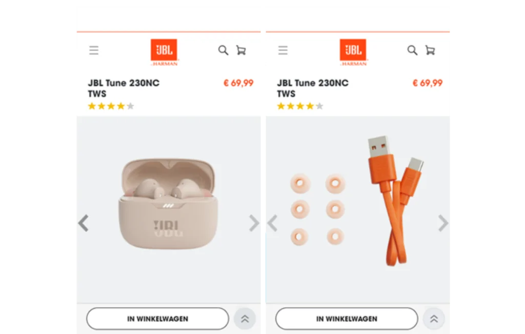Een grote ergernis bij gebruikers is twijfel over de meegeleverde accessoires. Zit er wel een oplaadkabel bij? En batterijen? Of moet ik die los mee bestellen? Door een afbeelding met meegeleverde accessoires toe te voegen, neemt JBL die twijfel bij de consument weg.
