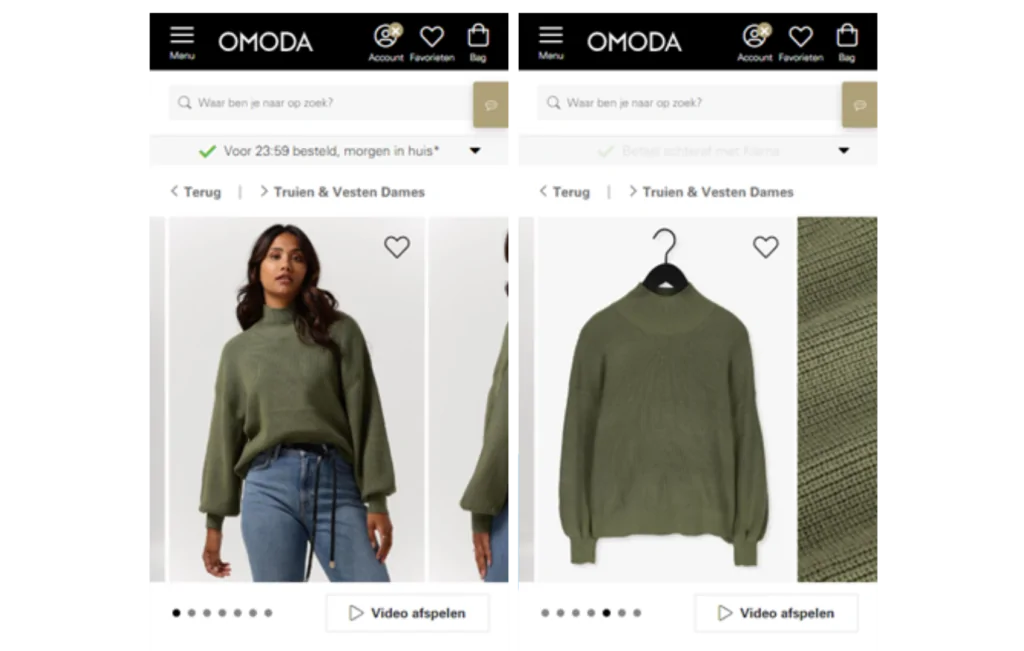 Deze tip is vooral van toepassing op de fashionbranche, maar het toevoegen van modelfotografie heeft in al onze experimenten een positief effect gehad op de omzet. Een kledingstuk op een persoon geeft gebruikers een beter beeld van de pasvorm. Daarnaast zien we in gebruikersonderzoek ook dat bezoekers deze beelden gebruiken om bijpassende kledingstukken te bepalen.