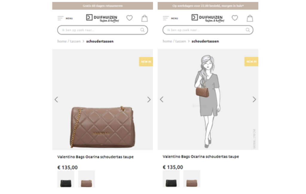 Op basis van een productafbeelding of de afmetingen is het lastig om in te schatten hoe groot een object is. En dat kan leiden tot twijfel voor aankoop, maar ook op teleurstellingen bij ontvangst. En dat leidt weer tot onnodige retouren. Bij Duifhuizen maken ze gebruik van een illustratie om te laten zien hoe groot een schoudertas ongeveer is. Dan weet je vooraf al of dit de maat is die je zoekt of dat je juist een maat groter of kleiner wil hebben. Deze tip kun je echter ook goed toepassen op andere categorieën als videocamera’s, tuingereedschap, koekenpannen en plantenpotten