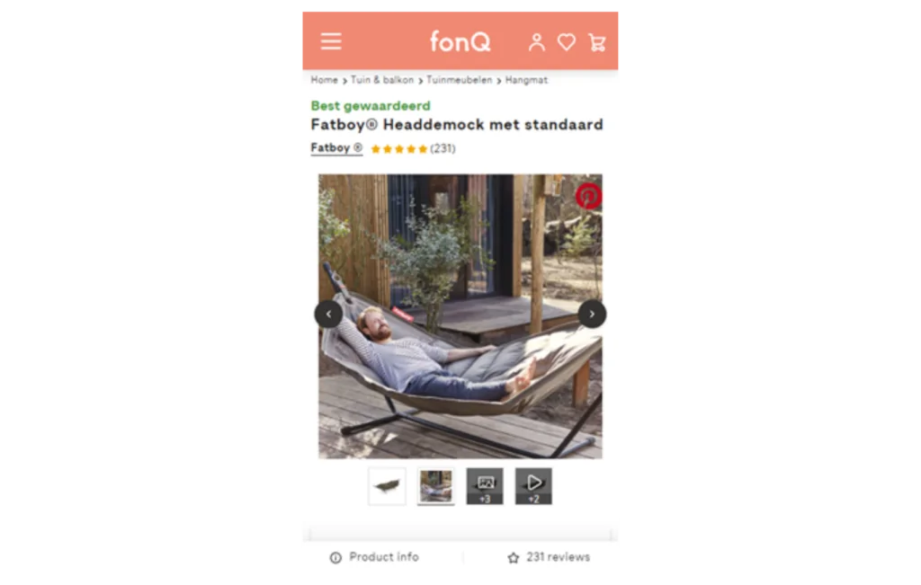 Laat een voorbeeld van het gebruik van een product zien. Dat inspireert de gebruiker. Want de afbeelding van bijvoorbeeld een hangmat is niet echt spannend. Maar als Fonq een afbeelding toont van een persoon in de hangmat op een vlonder, dan zie je jezelf al bijna liggen. Tegelijkertijd heb je ook direct een beeld bij de omvang van de hangmat en zie je dat een volwassen man meer dan genoeg ruimte heeft.