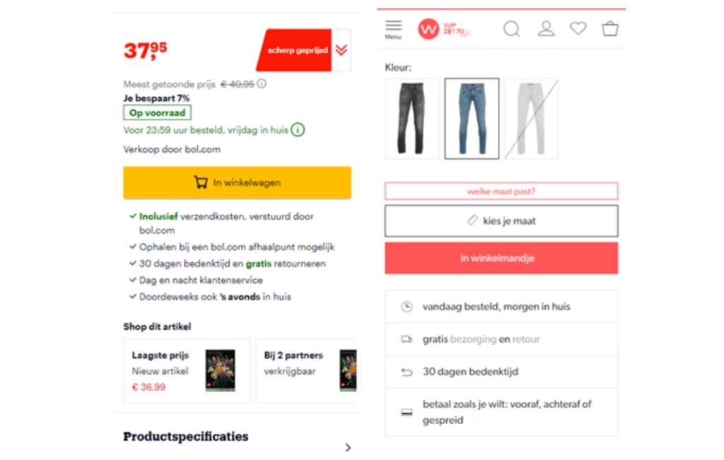 Webshops strooien met USP’s, in de header, op de homepage en ook op de PDP. Maar de positie is niet altijd optimaal. In onze experimenten zien we steeds terugkomen dat je de USP’s van je webshop dicht bij de ‘In winkelmand’-knop moet tonen. Gebruikers hebben op dit punt in het aankoopproces vaak nog zorgen over levertijd, retourbeleid en verzendkosten. Zorg er dus voor dat je die zorgen op deze plek wegneemt.