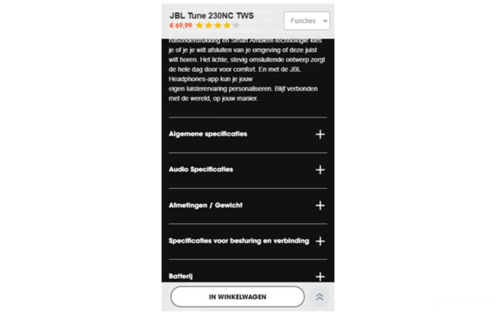We willen met z’n allen vaak veel vertellen op de PDP. En bij veel producten is het ook belangrijk om zoveel mogelijk informatie beschikbaar te maken. Maar als je alles onder elkaar plaatst, krijg je op een mobiele telefoon wel een hele lange pagina. Onze ervaring is dat uitklapbare blokken de beste gebruikerservaring geven. We zien ook nog wel eens een oplossing met tabs voorbijkomen, maar dat werkt meestal minder goed. De blokken laat je het best ingeklapt staan om de lengte van de pagina te beperken.