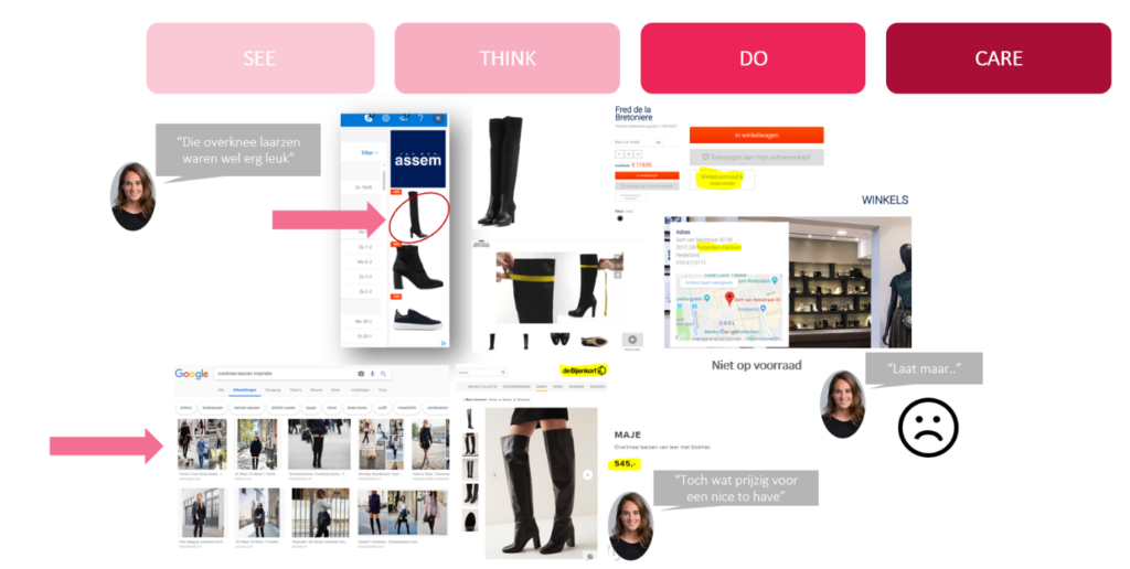 Bij het uitwerken van je online marketingstrategie is het van belang om een compleet beeld te vormen van welk pad je doelgroep aflegt. Hier zijn ontzettend veel variaties van mogelijk, mede doordat het online landschap continu verandert. Gebruik het See Think Do Care-model om je klantreis per fase in kaart te brengen (afbeelding 2).