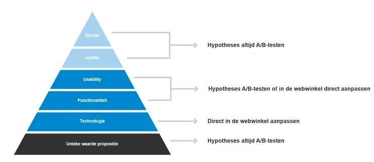 Theoretisch gezien moet je alle aanpassingen A/B testen voordat je deze op je webshop live zet. Toch zijn er ook een aantal aanpassingen waarbij testen niet noodzakelijk zijn. Technische aanpassingen zijn hier een voorbeeld van. Technische obstakels zijn zo duidelijk aanwezig dat deze direct aangepast moeten worden. Denk hierbij aan 404-errors of site speed issues. Deze obstakels moet je direct wegnemen zonder deze te testen. Ook zijn er functionele aanpassingen, zoals het verbeteren van de interne zoekfunctie, die direct doorgevoerd kunnen worden in plaats van deze eerst te testen.