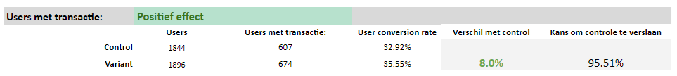 Door een A/B test uit te voeren weten we met statistische zekerheid of de aanpassing aan de webshop ook daadwerkelijk in een hogere omzet resulteert. Het is daarbij natuurlijk wel de bedoeling dat je de aanpassing ook structureel doorvoert op de webshop.