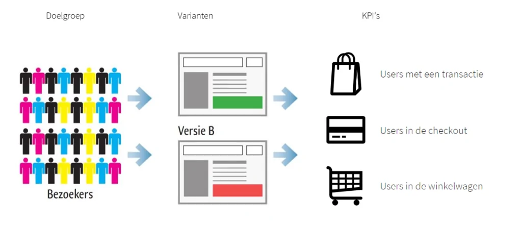Binnen een succesvol conversie-optimalisatie traject proberen we daarom zoveel mogelijk te A/B testen. Simpel gezegd is een A/B test een vorm van splittesten waarbij twee (of meer) varianten afwisselend aan de bezoekers getoond worden. Bij twee varianten ziet 50% van de bezoekers variant A (vaak de huidige webshop) en de andere 50% van de bezoekers ziet variant B (in de meeste gevallen een aanpassing aan de webshop). Tijdens zo’n A/B test wordt het conversieratio per variant gemeten en kun je na afloop van de test precies aflezen welke variant beter werkt voor jouw doelgroep.