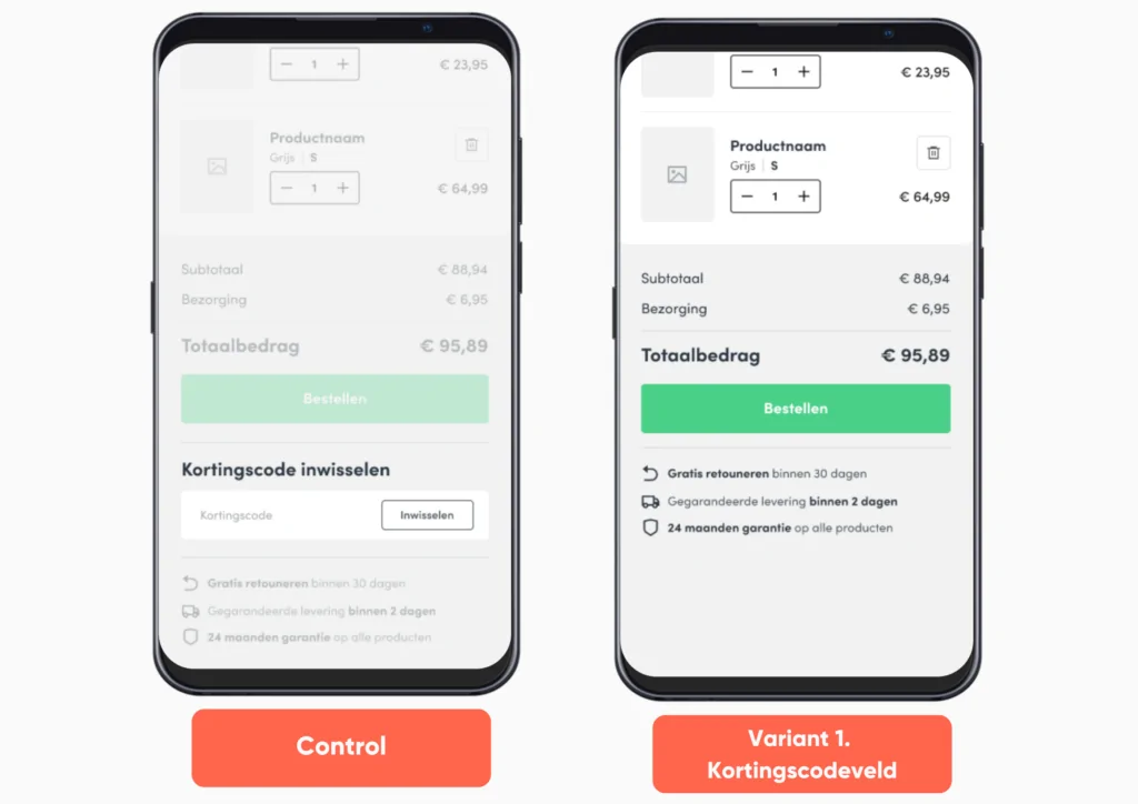 In het geval van het kortingscodeveld komt de winrate overeen met het marktgemiddelde, rond de 30%. Daarnaast vonden we op beide devices in 4 gevallen een positief resultaat op het aantal gebruikers dat een transactie deed. Hoe deze winnaars eruitzagen? Wij delen twee van onze best practice voorbeelden: