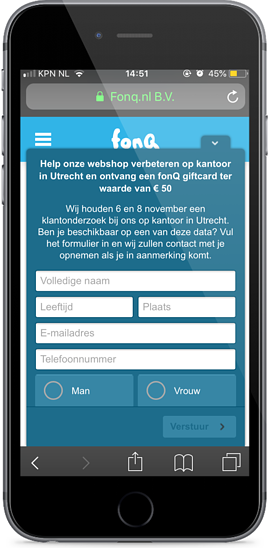 Een makkelijke manier om respondenten te werven is via een formulier in de webshop. In afbeelding 3 zie je een formulier die een klant ziet na een aankoop in de webshop van Fonq.nl.