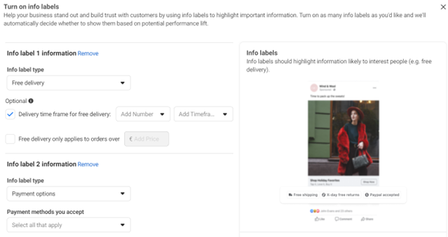 Je kunt voor je Meta ads nu ook custom info labels toevoegen aan je ads binnen campagnes met een traffic of conversiedoelstelling. Deze kun je vergelijken met de welbekende extensies die binnen Google Ads in te zetten zijn. Er zijn drie type custom labels waar je uit kunt kiezen: gratis verzending, retourbeleid en betalingsmethodes. Deze labels vul je verder aan met additionele informatie die van toepassing is voor jouw bedrijf.