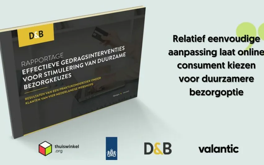 Uit het onderzoek onder ruim een half miljoen klanten blijkt dat relatief eenvoudige interventies op de check-outpagina van een webwinkel consumenten aanzetten om een duurzamere bezorgoptie te kiezen. Het standaard aanvinken van de duurzaamste bezorgoptie in combinatie met een duurzaamheidslogo of tekst leidt tot ruim twee keer zoveel duurzamere bezorgkeuzes als in de controleconditie. Uit het onderzoek blijkt dat het informeren van consumenten over de keuze met de laagste CO2-uitstoot daadwerkelijk substantiële duurzaamheidswinst oplevert, zonder dat het ten koste gaat van conversie.
