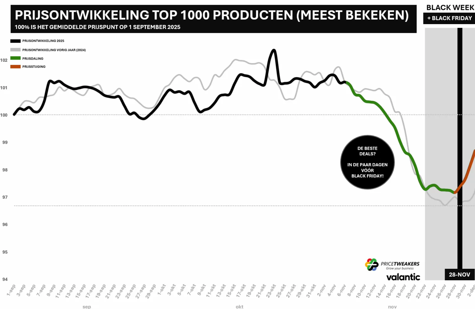 Samen met PriceTweakers analyseerden we de prijsontwikkeling van de top 1000 meest verkochte producten in de periode van 1 september tot en met 30 november 2025 (Black Friday = 28 november). En dat leidde tot interessante inzichten.