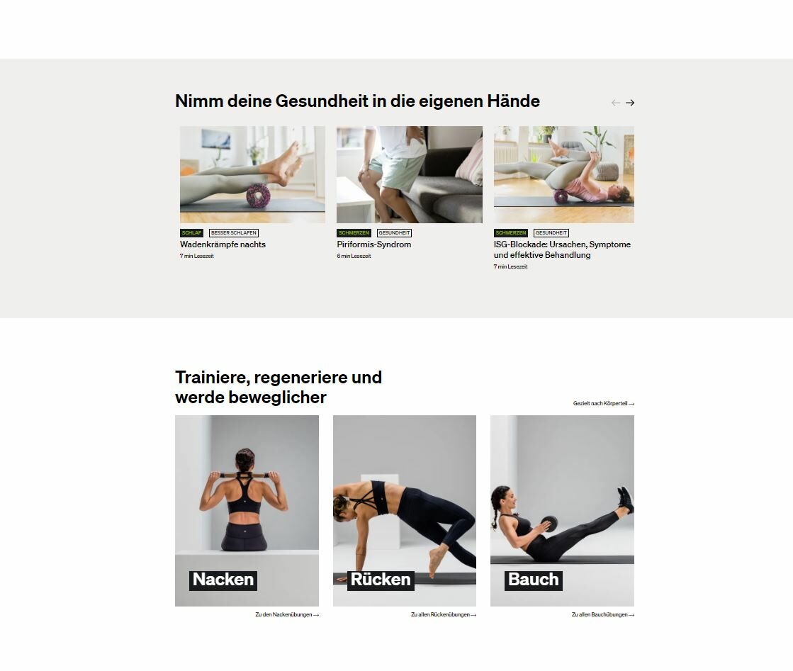 Naast de productcatalogus en shop bevat de blackroll.com website een uitgebreide content hub met instructies, oefeningen en toepassingstips. De verschillende contentgebieden en -kanalen moeten systematisch van elkaar worden gescheiden om de mogelijkheid te hebben deze stromen weer flexibel samen te voegen.