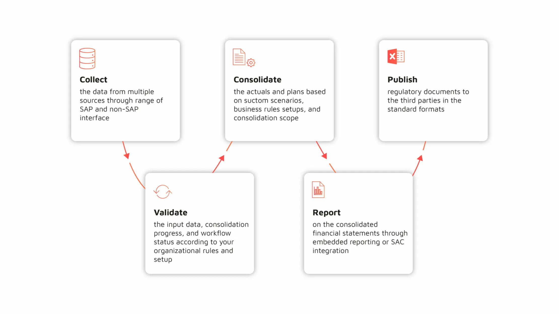 Esta solução fornece uma tecnologia aberta, configurável e preparada para o futuro que aborda todo o processo de consolidação numa única ferramenta, desde a modelação e captura de dados até às regras e ciclos, passando pelos relatórios e análises. Permite que os utilizadores empresariais personalizem as definições sem código e suporta múltiplas normas contabilísticas, períodos e cenários. Também reduz o esforço e os custos de consolidação e aumenta a transparência e a capacidade de auditoria dos resultados financeiros.