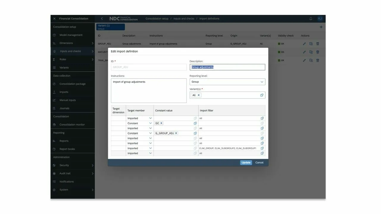 As capacidades desta solução proporcionam uma visibilidade abrangente e garantia de auditoria, uma vez que todos os passos são registados em pormenor. Isto começa com a importação do pacote de dados e termina com a finalização, o que garante a rastreabilidade e a conformidade com as auditorias externas. As funcionalidades de consolidação de matrizes e planos são particularmente notáveis. Comece com um modelo de consolidação padronizado e expanda-o com as suas próprias dimensões e atributos e tire partido de variantes e dependência de versões.