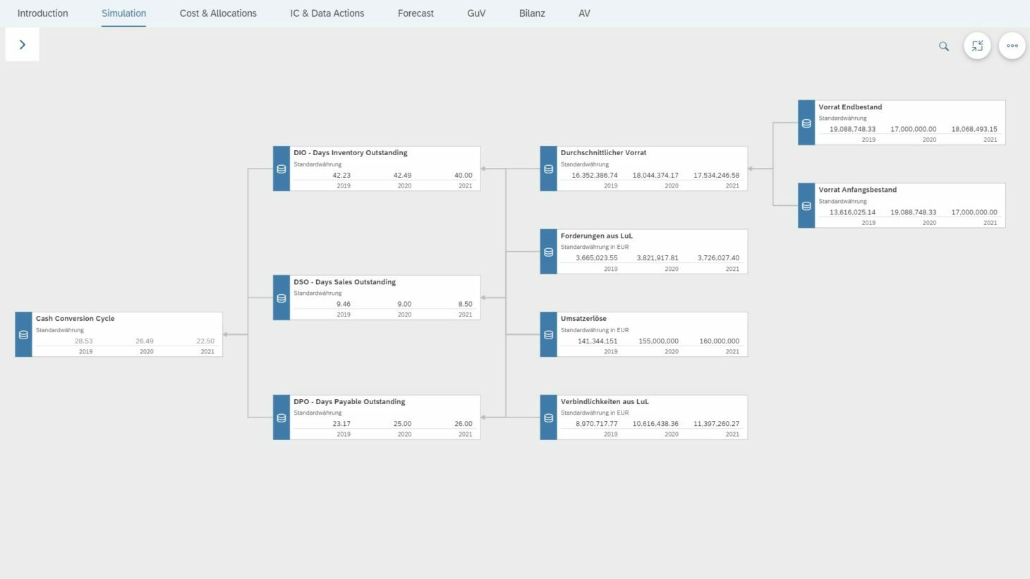 Com as funções integradas de planeamento, é possível incorporar os dados de forma otimizada e personalizá-los graças à semântica empresarial, às conversões de moeda e à lógica contabilística. Um caso de utilização frequente é o planeamento financeiro estratégico com os planos parciais.