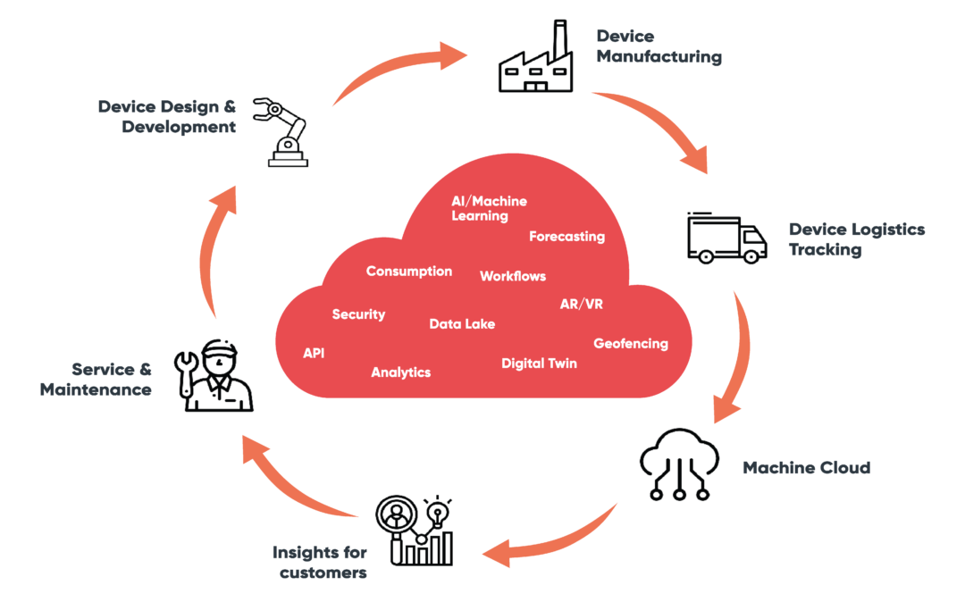 As plataformas IIoT vão muito além de simples lagoas de dados. O digital twin ideal deve conter informações de todo o ciclo de vida do produto — desde a conceção e entrada em serviços até à manutenção. Só assim é possível automatizar verdadeiramente todos os processos relacionados com o produto e gerar insights completos e de ponta a ponta.